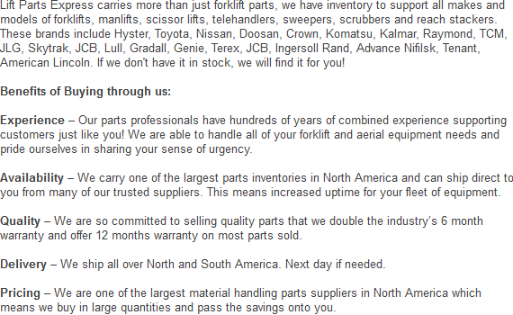 We have great prices on all our lift truck parts. Phone now to get a quote on one of the attachments or parts we offer. We can be reached at: